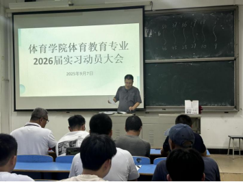 2025年9月7日晚,体育学院召开2026届毕业生实习生动员大会。体育学院副院长李进华、休闲体育系主任陈萍以及各实习队带队老师、辅导员参加会议。